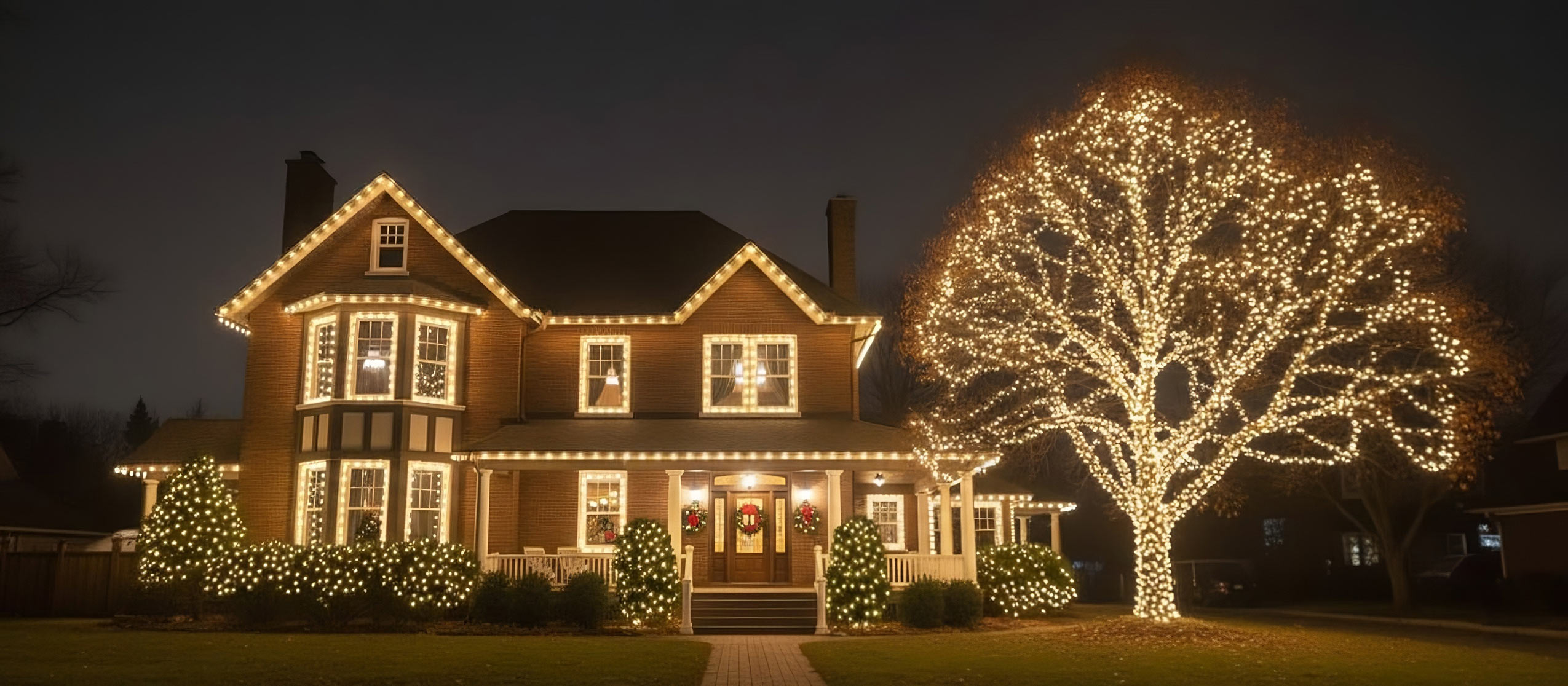 We exclusively install commercial-grade LED lights (not incandescent bulbs), which reduce electricity costs by 75-85% compared to traditional holiday lighting. A typical 2,500 sq ft home with full roofline + tree lighting costs only $15-$25/month to operate (vs $80-$120 with old-style bulbs). LEDs also last 25x longer and stay cool to the touch—eliminating fire risks from overheated bulbs.