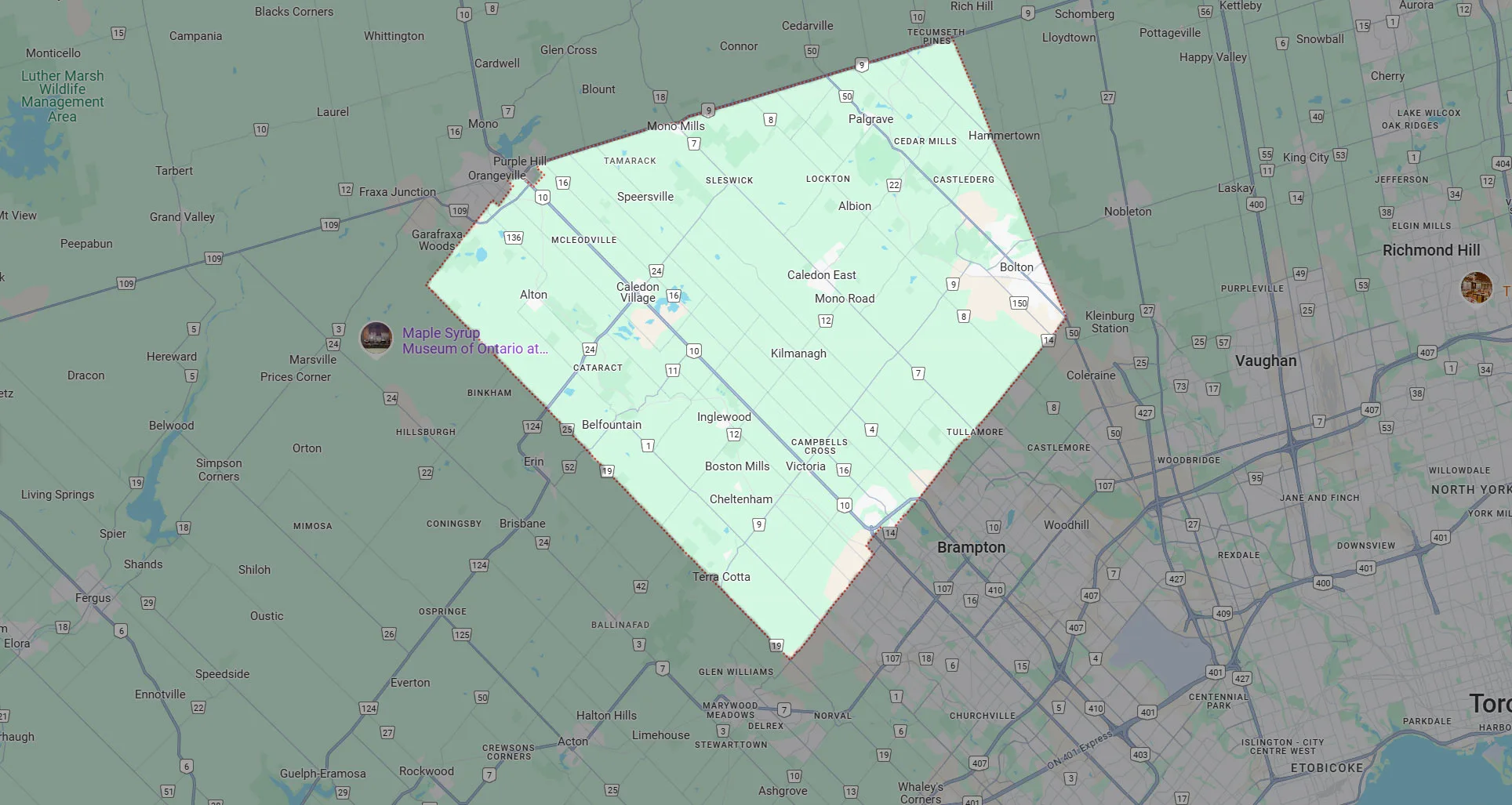 We cover every part of Caledon - Bolton, Caledon East, Caledon Village, Palgrave, Inglewood, Cheltenham, Alton, Belfountain, Mono Mills, Terra Cotta, Valleywood, and all properties along the Humber Station Road, Mississauga Road, and Airport Road corridors.