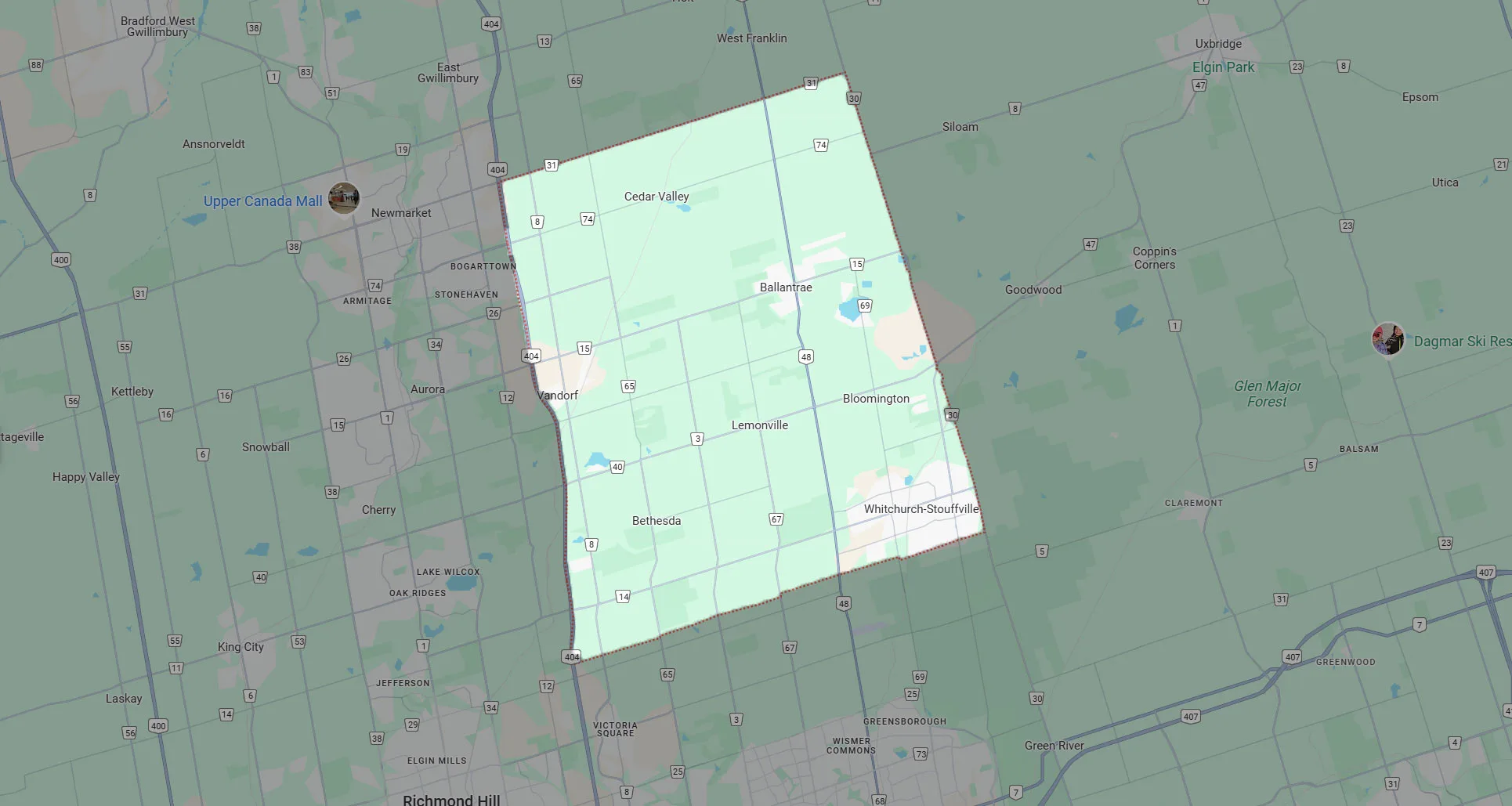 We serve all Stouffville and Whitchurch-Stouffville neighbourhoods including Downtown Stouffville, Main Street Village, Millard neighbourhood, Stouffville proper, Gormley, Ballantrae, Vandorf, Bethesda, Lemonville, Goodwood, and the Ninth Line and Highway 48 growth corridors.
